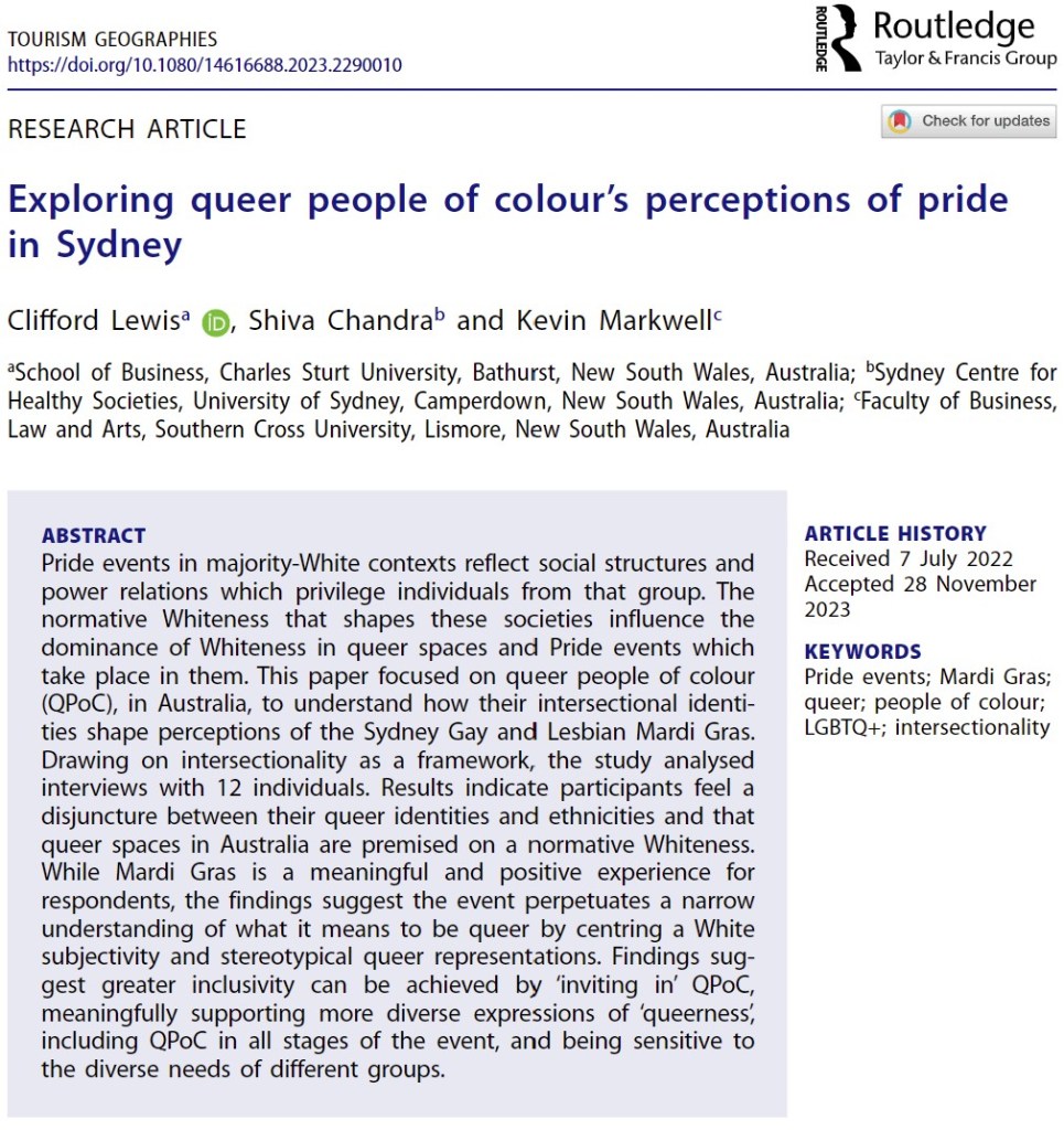 Lewis, C., Chandra, S., & Markwell, K. (2024). ‘An Intersectional Examination of Pride from the Perspective of Queer People of Colour.‘ Tourism Geographies (ABDC: A).