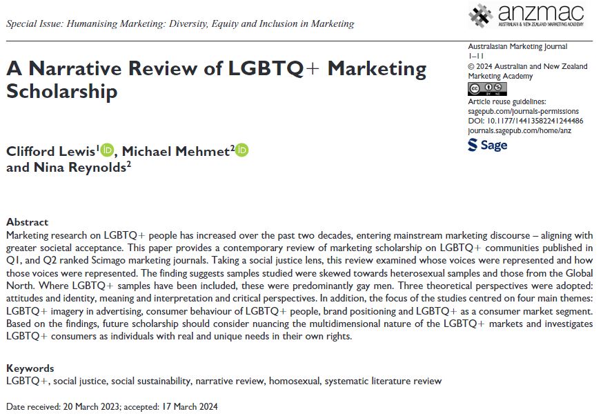 Lewis, C., Mehmet, M., & Reynolds, N. (2024). “LGBTQ+ voices in marketing scholarship: A narrative review with call for action.” Australasian Marketing Journal, (ABDC: A). ꗃ