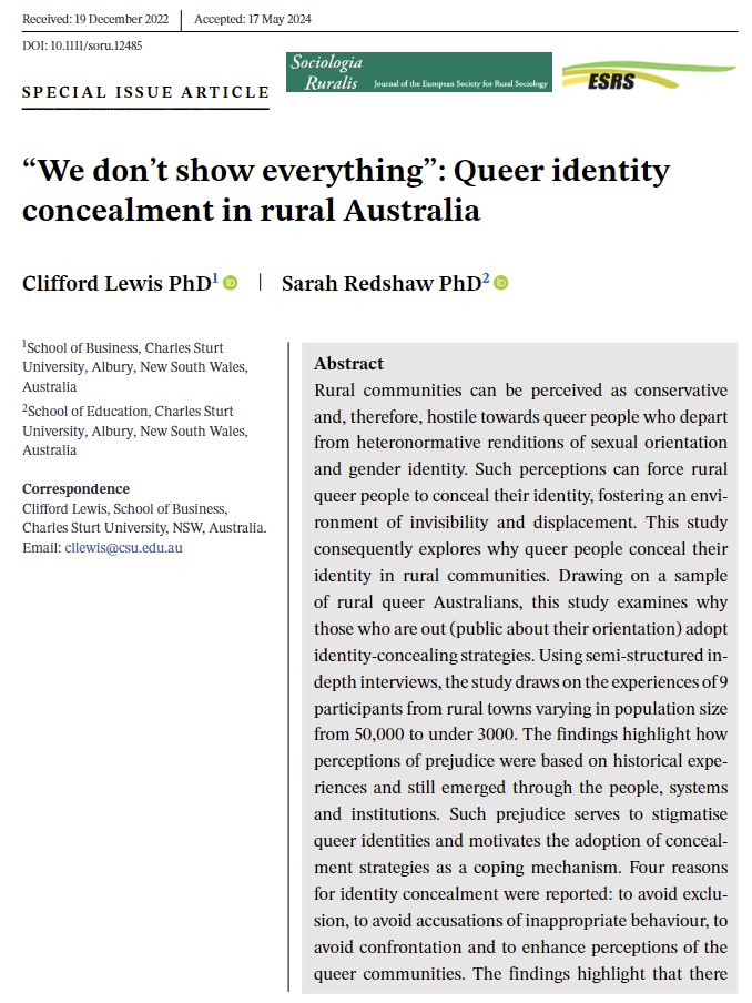 Lewis, C., & Redshaw, S. (2024). “’We don’t show everything’: Queer identity concealment in rural Australia.” Sociologia Ruralis (Scimagor Q1). ꗃ