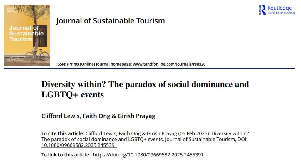 Lewis, C., Ong, F., & Prayag, G. (2025). Diversity within? The paradox of social dominance and LGBTQ+ events. Journal of Sustainable Tourism, 1-23 (ABDC A*). ꗃ