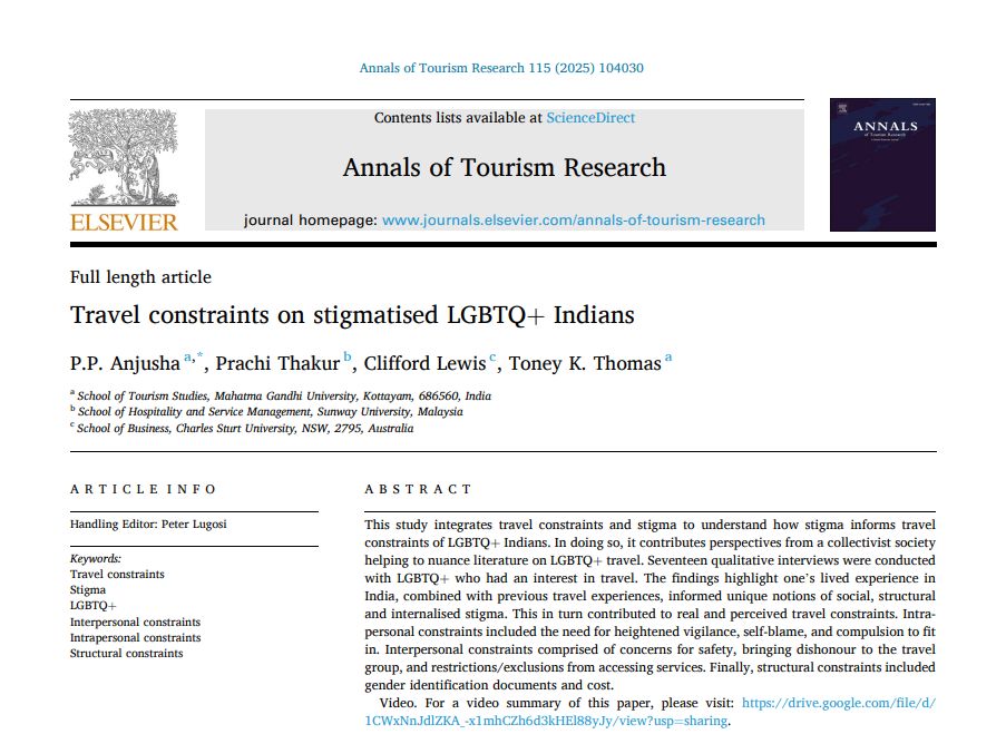 Anjusha, P.,Thakur, P., Lewis, C. & Thomas, T. (2025), Travel Constraints on Stigmatised LGBTQ+ Indians. Annals of Tourism Research, (A*)